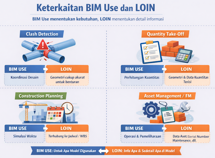 Pendekatan ini sejalan dengan prinsip ISO 19650, yaitu memastikan bahwa informasi yang diproduksi berada pada tingkat yang sesuai terhadap tujuan penggunaannya. Dengan demikian, LOIN menjadi alat pengendali mutu sekaligus efisiensi produksi informasi BIM.