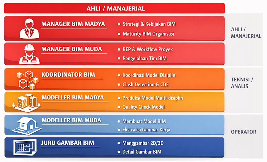 Kompetensi ini selaras dengan jabatan Juru Gambar BIM dan Modeler BIM Muda pada SKKNI BIM 2023. Sebagai pengingat, mayoritas lulusan sarjana tidak akan bekerja sebagai koordinator BIM atau manager BIM. Namun yang menjadi insinyur diharapkan mampu menerapkan pengetahuannya dalam proyek yang mengimplementasikan BIM.