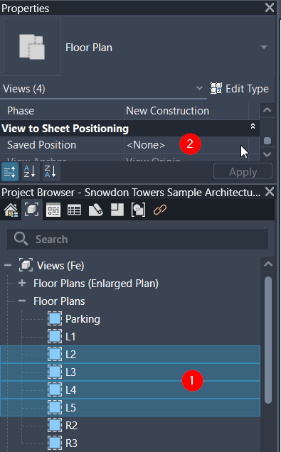 Pro Tip: You can select multiple viewports across different sheets in the Project Browser (1) and apply the positioning (2) settings in bulk to save even more time.