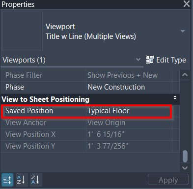 Select a Saved Position as the reference, and Revit will move the viewport to the matching coordinates automatically.
